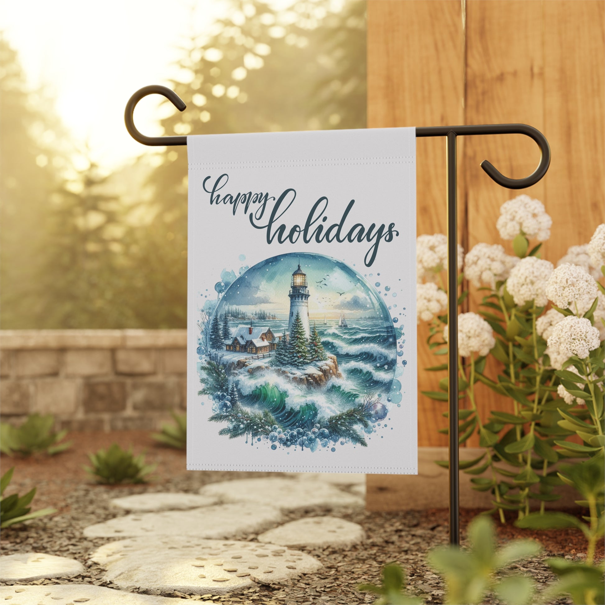 Christmas at the Lighthouse Holiday Garden Banner – Coastal Christmas Outdoor Decor